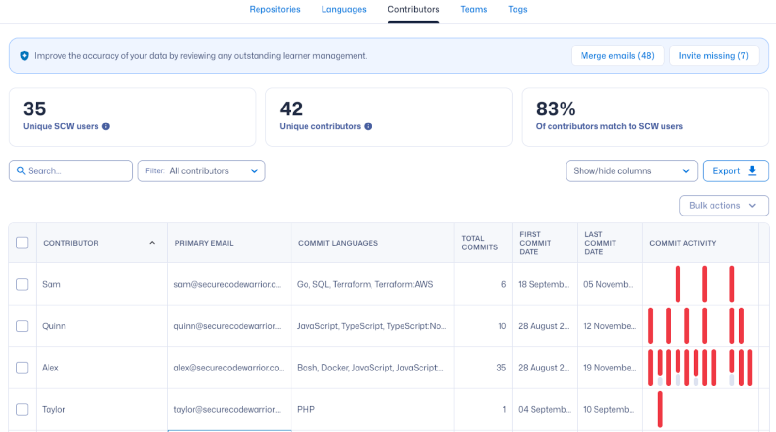 Trust Agent 会自动扫描您的集成资源库,以发现整个代码库中所有活跃的代码贡献者。这有助于解决入职(一个持续的过程)的关键挑战,并回答以下问题:您是否知道新工程师或承包商何时加入,以及他们是否立即接受了相关的安全编码教育?通过持续监控提交,我们可以确保立即识别每一位开发人员,并开始他们的安全编码之旅,消除典型的入职延迟,确保全面的计划范围。